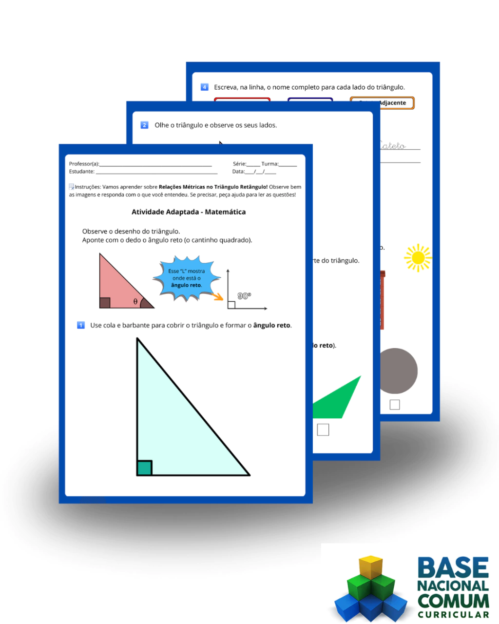 Auxiliar o estudante a reconhecer o triângulo retângulo, identificar o ângulo reto, diferenciar hipotenusa, cateto oposto e cateto adjacente, além de relacionar formas geométricas a situações reais (como as sombras de um prédio e de uma árvore).